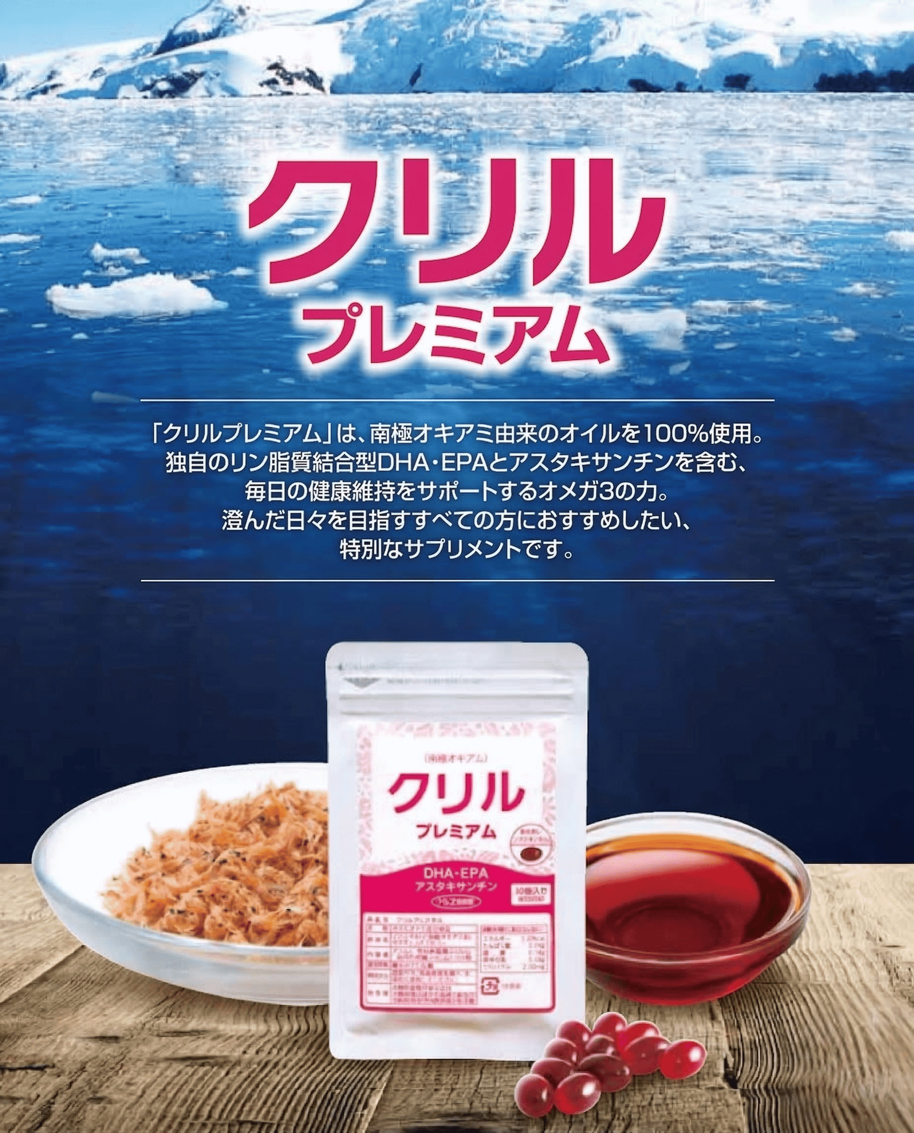 『クリルプレミアム』は、南極オキアミ由来のクリルオイル100%でできています。