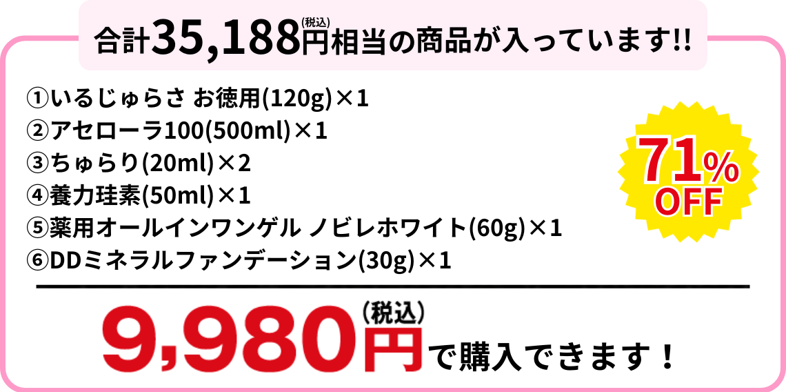 | セット内容 | ①いるじゅらさ お徳用(120g)×1 ②アセロラ100(500ml)×1 ③ちゅらり(20ml)×2 ④養力珪素(50ml)×1 ⑤薬用オールインワンゲル ノビレホワイト(60g)×1 ⑥DDミネラルファンデーション(30g)×1 ⓻泡立てネット×1 ⑧WEB限定プレゼント スッパイマン食べ比べセット(たねなし・たねあり) |