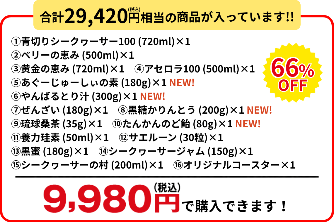 | セット内容 | ①青切りシークヮーサー100 (720ml)×1 ②ベリーの恵み (500ml)×1 ③黄金の恵み (720ml)×1 ④アセロラ100 (500ml)×1 ⑤あぐーじゅーしぃの素 (180g)×1 ⑥やんばるとり汁 (300g)×1 ⑦ぜんざい (180g)×1 ⑧黒糖かりんとう (200g)×1 ⑨琉球桑茶 (35g)×1 ⑩たんかんのど飴 (80g)×1 ⑪養力珪素 (50ml)×1 ⑫サエルーン (30粒)×1 ⑬黒蜜 (180g)×1 ⑭シークヮーサージャム (150g)×1 ⑮シークヮーサーの村 (200ml)×1 ⑯オリジナルコースター×1 ⑰WEB限定プレゼント スッパイマン食べ比べセット(たねなし・たねあり) |